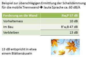 Laut DIN 4109 und VDI-Richtlinie 3728 ergeben sich Einbussen von ca. 10 dB. Die Forderung an die mobilen Trennwände muss entsprechend höher erfolgen. Nach DIN 4109 sollen Wände zwischen Unterrichtsräumen mindestens R‘w,B 47 dB erreichen. Unter Berücksichtigung der zu erwartenden Schalldämmeinbussen von 10 dB sollte ein Laborwert von min. Rw,P 57 dB ausgeschrieben und gefordert werden.