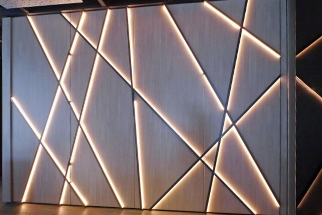 Bei dieser speziellen Lösung wurden pulverbeschichtete Aluminiumprofile in die Deckplatten eingelassen, diese sind seitlich mit LED beleuchtet. Die Streifen gehen über alle 4 Trennwandelemente und bilden einen fliessenden Übergang.