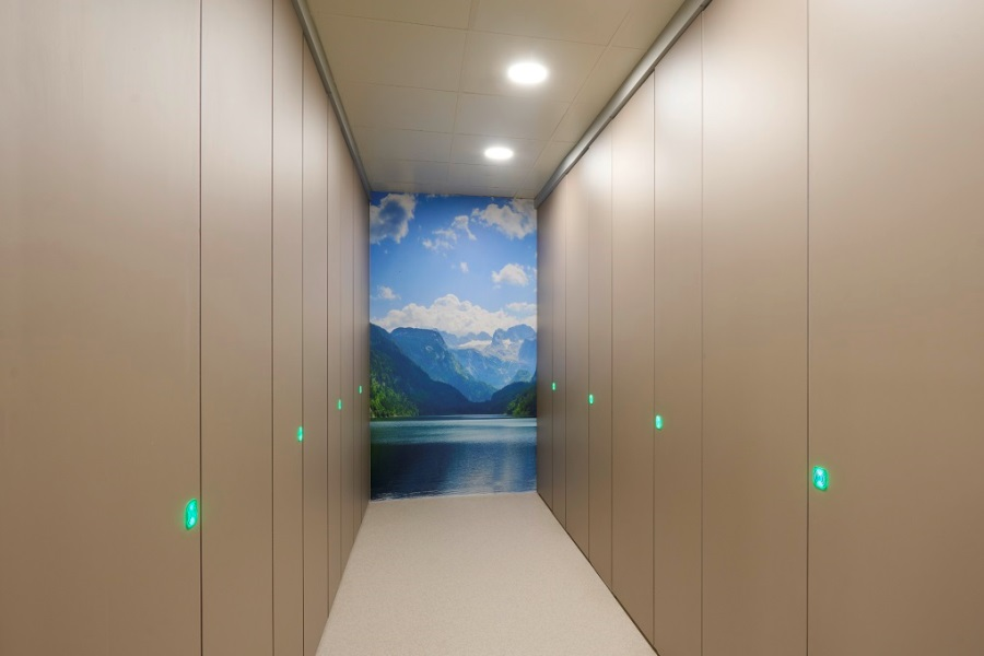 Das WC-Trennwandsystem Look & Wave ermöglicht ein berührungsloses Bedienen der Kabinentür. Mit Hilfe einer modernen LED-Sensortechnologie reicht das blosse Annähern mit der Hand, um die Tür zu ver- oder entriegeln. Ein festes Zugreifen ist für die Bedienung nicht notwendig. Gerade für Personen mit eingeschränkter Grifffähigkeit wird dieser Vorgang so erheblich vereinfacht. Der ausbleibende Hautkontakt sorgt überdies für eine verbessere Hygiene im Sanitärraum. Des Weiteren verfügt die Anlage über eine Anzeige, welche den Belegungszustand der Kabine gut sichtbar signalisiert. Ein weiterer Sensor zeigt – nach einer vorher definierten Anzahl an Nutzern – wann die Kabine gereinigt werden muss. Bei einem Stromausfall öffnen sich die Kabinentüren automatisch und Nutzer können ungehindert die Kabine verlassen. Zudem steht dem Personal ein Serviceschlüssel zur Verfügung, mit dem im Notfall die Kabinentür von aussen entriegelt werden kann.