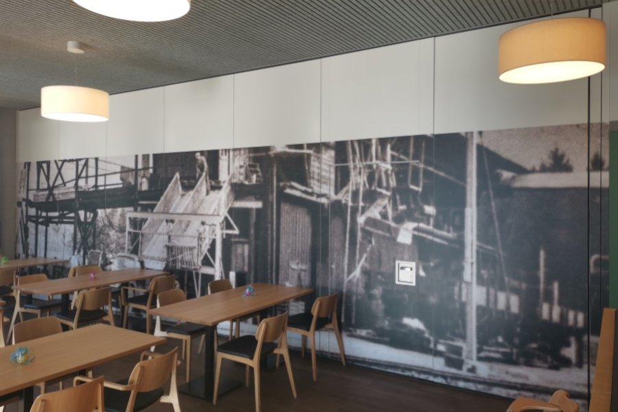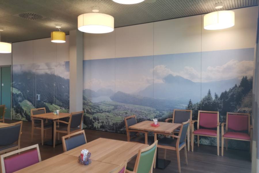 Vereinzelt haben wir Sonder-Wandanschlüsse realisiert, mit welchen in der Parkstellung das Teleskopelement den Abschluss der Parkierung bildet. Im Bereich des Restaurants wurden unsere Elemente vom Nutzer mit mehrteiligen Wandbildern beklebt.