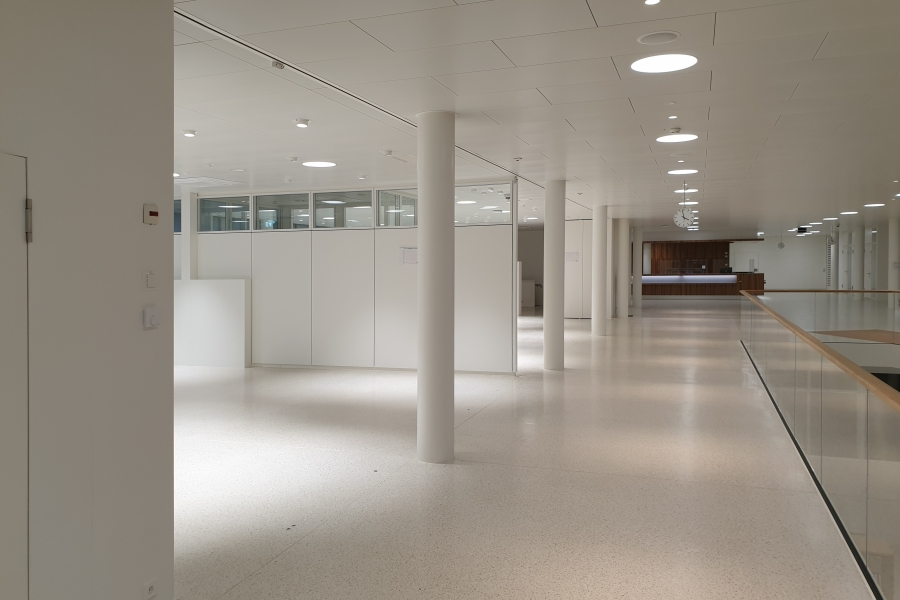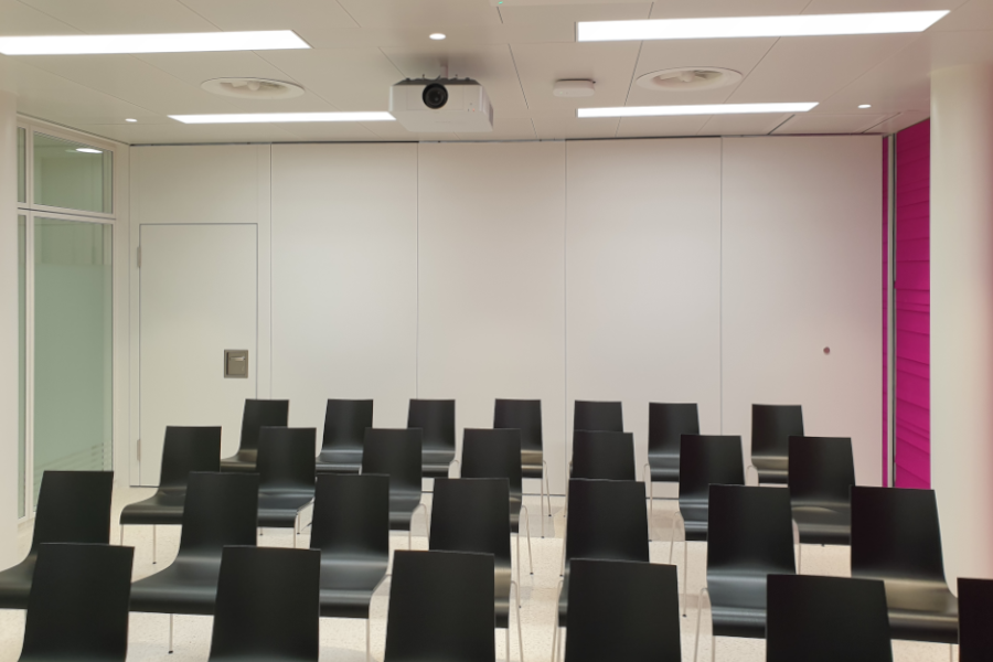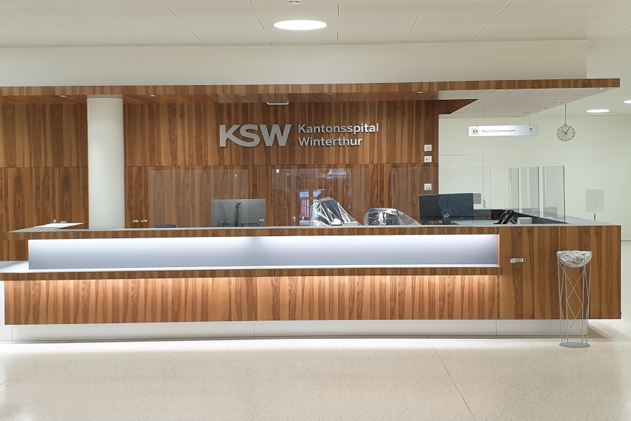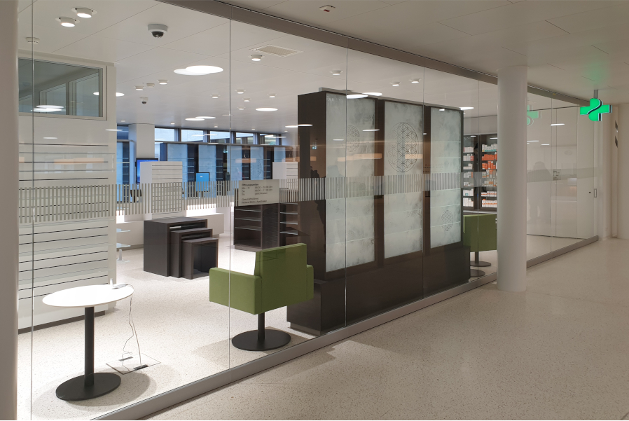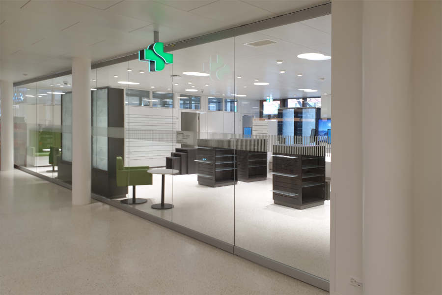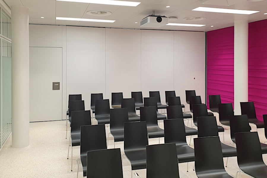 Wir durften bei diesem Objekt im Bereich der mobilen Trennwandtechnik behilflich sein und zwei verschiedene Trennwandsysteme der Firma Nüsing planen und einbauen. Zum einen kamen drei Nüsing Premium Greenline Trennwände, die unter anderem durch eine Schalldämmung von 57 dB sowie einem ECO-Zertifikat überzeugen, bei den Schulungsräumen im UG zum Einsatz. Dank der mobilen Trennwände kann die Grösse der Räume flexibel angepasst werden und durch den gegebenen Schallschutz können auch mehrere Schulungen gleichzeitig stattfinden. Ausserdem findet man die „grüne“ Trennwand auf der Kinderaufnahmestation im 1.OG. Im Erdgeschoss bilden drei Glastrennwände der Produktlinie Visioline einen Abschluss für die Bistro-Lounge, der Apotheke und dem Kiosk.