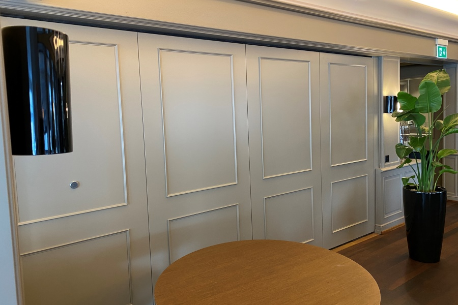 Bei diesem Projekt lautete die Vorgabe, den Speisesaal mit minimalstem Aufwand in ein grosses und kleines Sitzungszimmer umzuwandeln. Dabei war es ebenso wichtig, eine Schallschutzanforderung von 48 dB zu erfüllen und die klassisch gestemmten Massivholzfronten in die Faltwand zu integrieren.