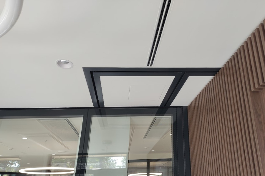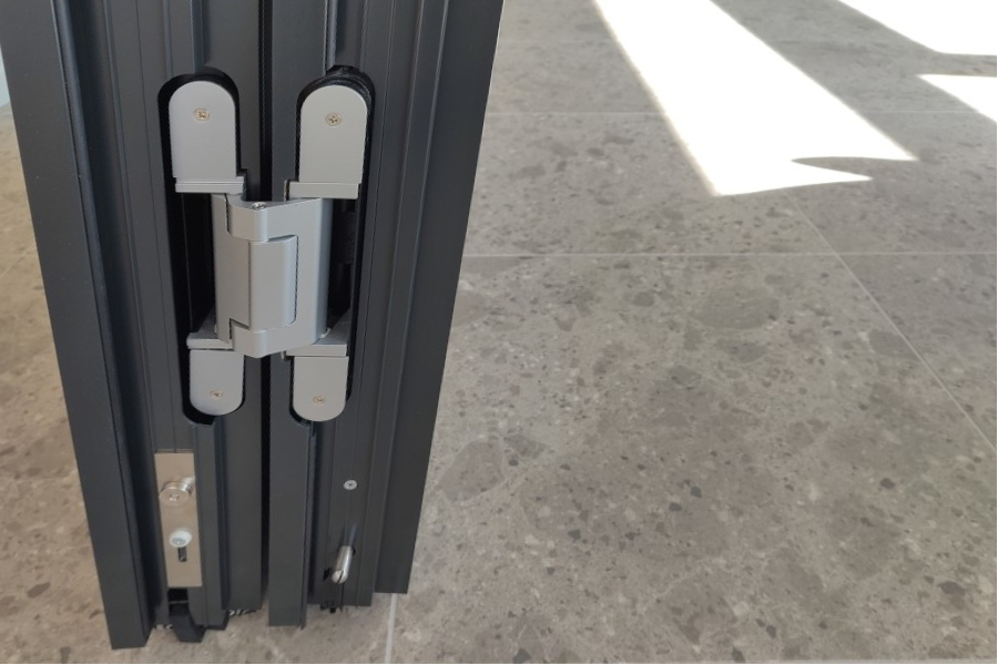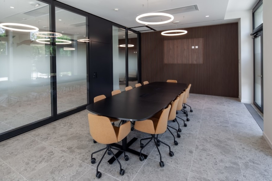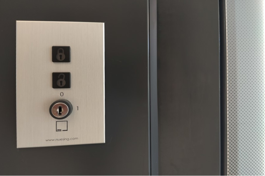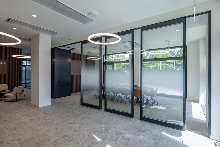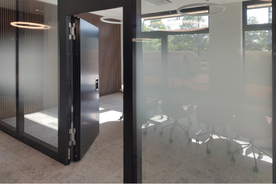 Im Zuge des Mieterausbaus für die neue Filiale der next Bank in Dübendorf durften wir zwei mobile Trennwände liefern und montieren. Zur Ausführung kamen Nüsing Premium Glas-Anlagen, halbautomatisch mit Schlupftüren und auf Kundenwunsch in Ausführung ohne Glas. Sämtliche sichtbaren Teile, inklusive aller Profile und der Muscheldrücker wurden ebenfalls passend in RAL 7021 schwarzgrau gepulvert. Bewusst wurde hier auf innenliegende Jalousien verzichtet, ebenso auf integrierte Flachbildschirme. Die Schlupftüren wurden mit verdeckt liegenden Bändern SIMONSWERK TECTUS TE 640 3D A8 ausgestattet.