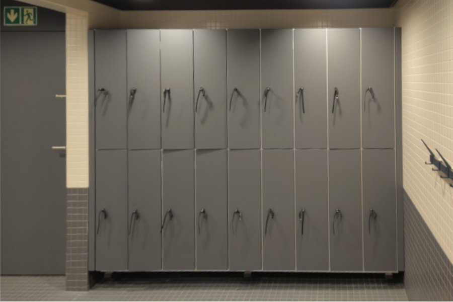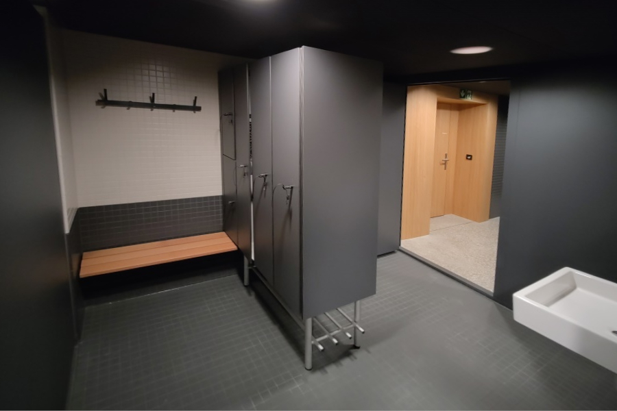 In den Garderoben zum hauseigenen Schwimmbad konnten wir unsere Garderobenschränke GVKF13, komplett aus robusten Vollkernplatten liefern und montieren. Für die Mädchen- und Jungengarderoben jeweils 36 Schränke mit Münzdepotschlössern und für die Lehrerinnen und Lehrergarderoben je 5 Schränke. Ein weiteres optisches Highlight sind die eingravierten Nummern anstelle von Plättchen mit Nummern.