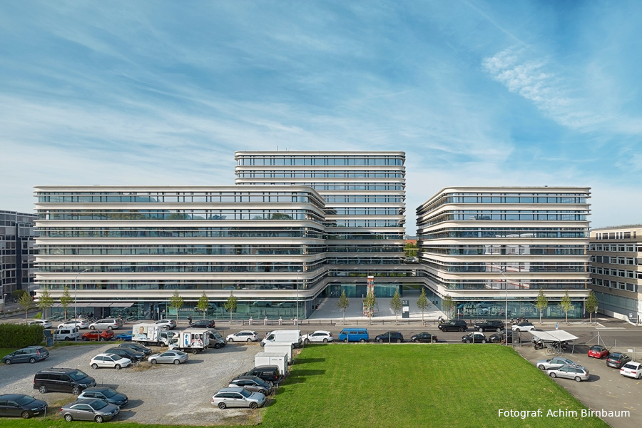 Das äussere Erscheinungsbild ist geprägt durch die vorgehängte, elegante Betonfassade. Sie strukturiert die Gebäude und betont zugleich ihren baulichen Zusammenhang. Die thermische Hülle mit grossflächiger Fensterverglasung wird ergänzt durch umlaufende Betonelemente, die Dank ihres weiten Auskragens für natürliche Selbstbeschattung sorgen und zusätzlichen äußeren Sonnenschutz verzichtbar machen.