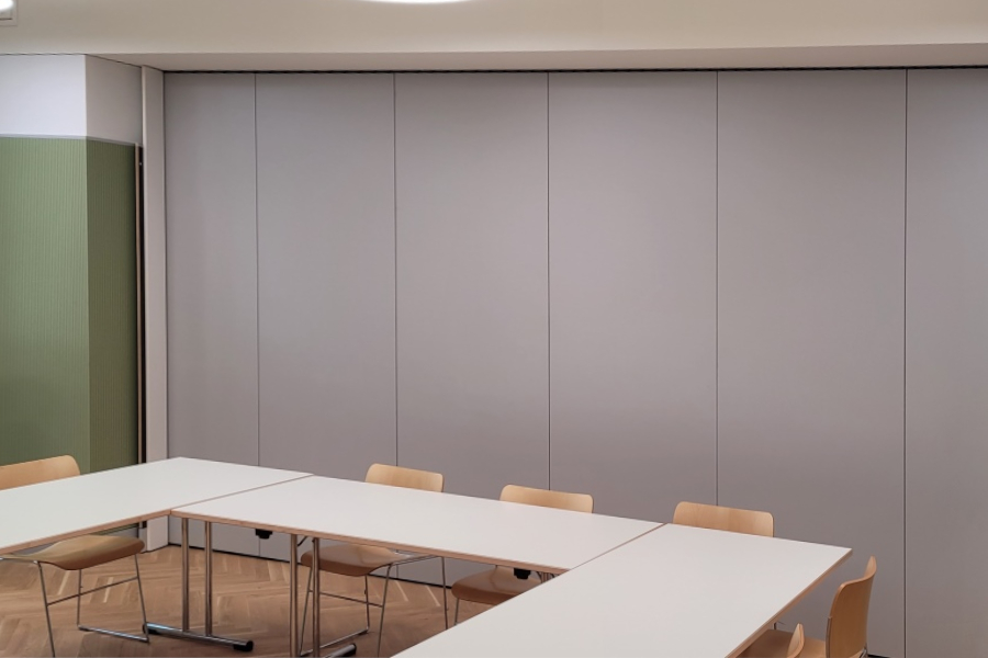 Durch verschiedene Hands-on-Einsätze unserer Geschäftsleitung im „Wagi“ konnten wir auf die Unterstützung des Bauherrn zählen und sind im alten Gebäudeteil 11 mit der Ausführung der mobilen Schallschutz-Trennwände von Nüsing beauftragt worden. Zum Einsatz kamen 2 Wände unserer Premium Greenline 57 dB, Minergie-Eco Vorgaben wurden damit vollumfänglich erfüllt. Es galt, die Anschlüsse an die bestehende Konstruktion anzupassen, was zur vollen Zufriedenheit des Bauherrn aber auch des GU’s und der Architektur ausgeführt wurde.